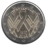 Le ruban rouge symbolisant la lutte contre SIDA (colorisé sur les pièces en qualité Brillant universel et Belle Épreuve) entouré de deux autres rubans placés à l'envers et formant chacun un V pour victoire (sur la maladie). Sur le ruban de gauche, les mots JOURNÉE MONDIALE. Sur le ruban de droite, les mots CONTRE LE SIDA. En haut, la date de la Journée mondiale contre le SIDA, 1er DÉCEMBRE. En bas, les initiales du pays émetteur RF (pour République française) et le millésime 2014. L'anneau externe de la pièce comporte les douze étoiles du drapeau européen. | ||||||