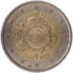 Tous les pays de la zone euro ont émis le 1er janvier une pièce commémorative de 2 € pour célébrer le 10e anniversaire de l'Union économique et monétaire. Le centre de la pièce illustre une silhouette humaine stylisée dont le bras gauche est prolongé par le symbole de l'euro. Le nom du pays émetteur RÉPUBLIQUE FRANÇAISE apparaît dans la partie supérieure, tandis que l'indication 1999-2009 et l'acronyme UEM (pour Union économique et monétaire) apparaissent dans la partie inférieure. L'anneau externe de la pièce représente les douze étoiles du drapeau européen. | ||||||