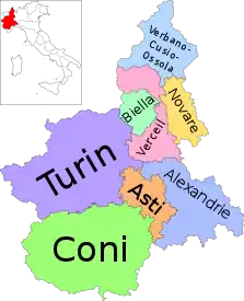 Le Piémont est divisé en sept provinces et une ville métropolitaine (portant le nom de leur chef-lieu) :
