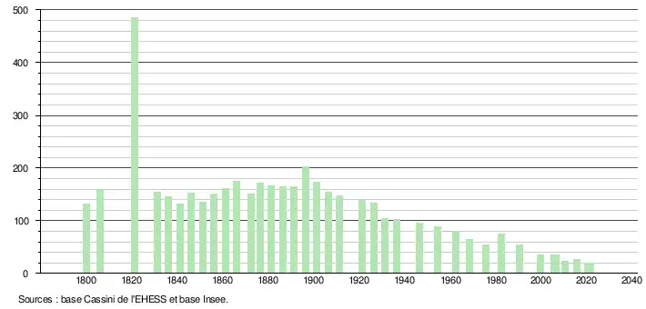 L'évolution du nombre d'habitants est connue à travers les recensements de la population effectués dans la commune depuis 1800. Pour les communes de moins de 10 000 habitants, une enquête de recensement portant sur toute la population est réalisée tous les cinq ans, les populations légales des années intermédiaires étant quant à elles estimées par interpolation ou extrapolation[10]. Pour la commune, le premier recensement exhaustif entrant dans le cadre du nouveau dispositif a été réalisé en 2005[11].