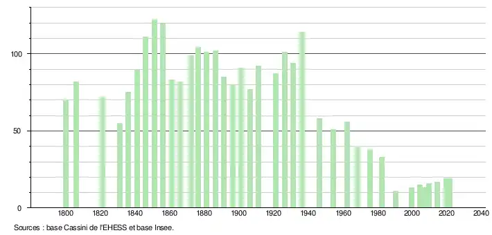 L'évolution du nombre d'habitants est connue à travers les recensements de la population effectués dans la commune depuis 1800. Pour les communes de moins de 10 000 habitants, une enquête de recensement portant sur toute la population est réalisée tous les cinq ans, les populations légales des années intermédiaires étant quant à elles estimées par interpolation ou extrapolation[12]. Pour la commune, le premier recensement exhaustif entrant dans le cadre du nouveau dispositif a été réalisé en 2004[13].