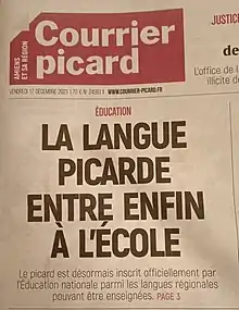 L'Éducation nationale a inscrit le 16 décembre 2021 le picard parmi les langues régionales pouvant être enseignées à l'école, au collège et au lycée des académies d'Amiens et de Lille[6].