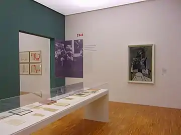 Chaque année débute par une photographie historique géante liée à l'actualité. Pour l'année 1940, Picasso voyage entre Royans et Paris où il peint d'inquiétantes peintures de poissons dentés comme Café à Royans en . Sans peindre la guerre, il va représenter la violence dans ses tableaux. En 1941, alors que Picasso et sa compagne Dora restent dans un Paris soumis aux restrictions, il peint le Jeune garçon à la langouste défiant ainsi l'occupant nazi. Cette même année, il peint sa compagne dans les tableaux Buste de femme et Femme assise dans un fauteuil. En 1942, toujours reclus dans son atelier des Grands-Augustins, il réalise une sculpture d'une tête en bronze peinte mais également ses tableaux L'Aubade et Nature morte au crane de taureau, hommage à son ami Julio González qui vient de décéder. Ce dernier tableau servant d'affiche pour l'exposition[12].
