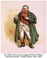 Enfin, dans le roman, puis dans l'imagination populaire, le nom « Pickwickien » (Pickwickian) désigne une catégorie bien définie d'individus, les membres du Pickwick Club[46] ; d'où le nécessaire emploi de la majuscule française signifiant leur appartenance à un groupe s'assimilant à une ethnie, et au-delà, toute personne dont le physique ou le caractère, voire les deux, rappelle le personnage de Dickens.