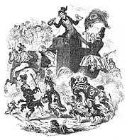 Le nouvel illustrateur est Robert W. Buss (1804-1875)[21], mais, le travail qu'il réalise pour le troisième numéro n'étant pas jugé à la hauteur, il est sommairement remercié[N 3],[22]. C'est le jeune Hablot Knight Browne (1815-1882), âgé de vingt ans, qui le remplace, au détriment de Thackeray[N 4],[23] qui s'était porté candidat[10]. Il inaugure ainsi une collaboration de vingt-trois ans avec Dickens[24], et, pour l'occasion, afin de rester dans la veine du nom de plume de son employeur « Boz », il adopte, en accord avec Dickens, le pseudonyme qui le rendra célèbre, « Phiz »[10], abréviation argotique de physiognomy (physionomie, visage)[N 5],[25], mot très à la mode en cette première partie du XIXe siècle[N 6]. Browne jouit déjà d'une certaine renommée, car il vient d'être récompensé pour son estampe du John Gilpin de William Cowper (1731-1800) où un cavalier à la mine déconfite perché sur un cheval mors aux dents annonce bien des plans du futur Pickwick auquel il va collaborer[15],[26].