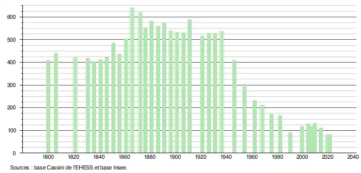 L'évolution du nombre d'habitants est connue à travers les recensements de la population effectués dans la commune depuis 1800. Pour les communes de moins de 10 000 habitants, une enquête de recensement portant sur toute la population est réalisée tous les cinq ans, les populations légales des années intermédiaires étant quant à elles estimées par interpolation ou extrapolation[9]. Pour la commune, le premier recensement exhaustif entrant dans le cadre du nouveau dispositif a été réalisé en 2004[10].