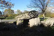 Côtés ouest, sud et nord, plusieurs autres dalles massives sont couchées au sol. Côté sud et nord, elles semblent alignées, respectivement selon un axe est-ouest et un axe est-sud-est/ouest-nord-ouest. Il pourrait s'agir des vestiges d'un parement. Une dalle du côté sud comporte une gravure de forme ovale obtenue par bouchardage, qui pourrait représenter une hache polie[1].