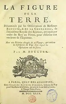 - La figure de la Terre, déterminée par les observations de Messieurs Bouguer, et de La Condamine, de l'Académie royale des sciences, envoyés par ordre du Roy au Pérou, pour observer aux environs de l'équateur, avec une Relation abrégée de ce voyage, qui contient la description du pays dans lequel les opérations ont été faites, 1749