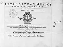 - Petri Cadeac musici excellentissimi moteta, quatuor, quinque & sex vocum. Liber primus. - Paris : Adrian Le Roy et Robert Ballard, 1555. RISM C 13 = Lesure 1955 n° 15.