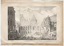 On mentionnera encore Thomas Froideau (1757-1824) cité dans les registres de l'Académie d'architecture[60], qui nous intéresse en tant qu'auteur d'un dessin représentant la démolition du Palais de Justice en 1777, et gravé depuis (Bibliothèque Sainte-Geneviève)[61]. Ce dessin est important car il nous montre le petit bâtiment du Trésor des Chartes accolé à la Sainte-Chapelle, qui sera détruit par Desmaisons pour édifier les ailes symétriques de la cour du Mai[62]. A droite, le dernier arbre de mai, une coutume depuis disparue.