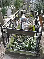 Ses obsèques se déroulent au cimetière du Père-Lachaise à Paris. Ses cendres sont inhumées après sa crémation dans une tombe provisoire, puis dans la division 10. Sa sépulture est un jardinet entouré d'une grille avec une simple plaque, où ses cendres ont été mélangées à la terre (sur dérogation de la Ville de Paris)[37].