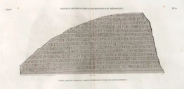 À l'époque de la découverte de la pierre de Rosette, la compréhension des hiéroglyphes égyptiens est perdue depuis la fin de l'Empire romain. Cet oubli s'est opéré en trois temps[50]. L'usage des hiéroglyphiques s'est peu à peu spécialisé de sorte que, dès le IVe siècle de notre ère, peu d'Égyptiens étaient capables de les lire. En 391, l'empereur romain Théodose Ier ordonne la fermeture des temples païens, ce qui porte un coup fatal à cette écriture sacrée[51]. L'inscription hiéroglyphique la plus récente connue, trouvée à Philæ, le graffito d'Esmet-Akhom (en), est datée de l'an 394.