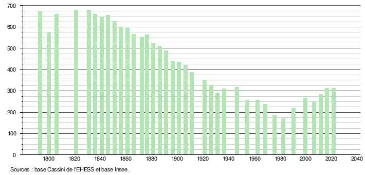 L'évolution du nombre d'habitants est connue à travers les recensements de la population effectués dans la commune depuis 1793. Pour les communes de moins de 10 000 habitants, une enquête de recensement portant sur toute la population est réalisée tous les cinq ans, les populations légales des années intermédiaires étant quant à elles estimées par interpolation ou extrapolation[15]. Pour la commune, le premier recensement exhaustif entrant dans le cadre du nouveau dispositif a été réalisé en 2006[16].