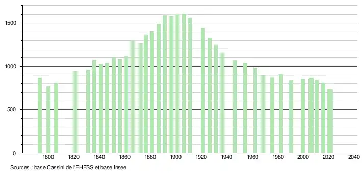 L'évolution du nombre d'habitants est connue à travers les recensements de la population effectués dans la commune depuis 1793. Pour les communes de moins de 10 000 habitants, une enquête de recensement portant sur toute la population est réalisée tous les cinq ans, les populations légales des années intermédiaires étant quant à elles estimées par interpolation ou extrapolation[57]. Pour la commune, le premier recensement exhaustif entrant dans le cadre du nouveau dispositif a été réalisé en 2005[58].
