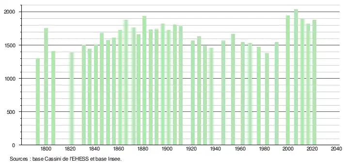 L'évolution du nombre d'habitants est connue à travers les recensements de la population effectués dans la commune depuis 1793. Pour les communes de moins de 10 000 habitants, une enquête de recensement portant sur toute la population est réalisée tous les cinq ans, les populations légales des années intermédiaires étant quant à elles estimées par interpolation ou extrapolation[26]. Pour la commune, le premier recensement exhaustif entrant dans le cadre du nouveau dispositif a été réalisé en 2006[27].
