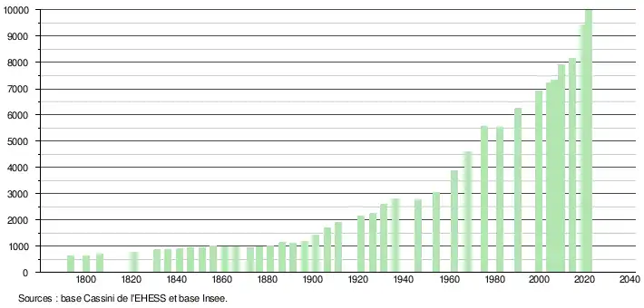 L'évolution du nombre d'habitants est connue à travers les recensements de la population effectués dans la commune depuis 1793. Pour les communes de moins de 10 000 habitants, une enquête de recensement portant sur toute la population est réalisée tous les cinq ans, les populations légales des années intermédiaires étant quant à elles estimées par interpolation ou extrapolation[43]. Pour la commune, le premier recensement exhaustif entrant dans le cadre du nouveau dispositif a été réalisé en 2004[44].