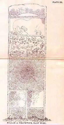 Cette pierre fut trouvée à Shandwick, au sud de Balintore, dans l'Easter Ross, en raison de quoi elle est aussi appelée pierre de Shandwick. Il s'agit d'une classe 2 avec la croix d'un côté et une scène laïque de l'autre, en six panneaux :