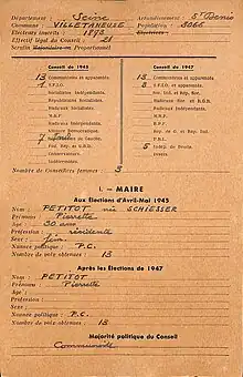 En 1944, le droit de vote et d’éligibilité des femmes est légalisé. Aux élections municipales de mai 1945, Pierrette Petitot, jeune militante communiste, s’engage sur la liste issue de la résistance qui remporte le scrutin[2]. Yves Mahé est élu maire, avant de démissionner quelques mois plus tard[2]. Le conseil municipal choisit alors à la majorité Pierrette Petitot pour lui succéder[2].