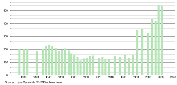 L'évolution du nombre d'habitants est connue à travers les recensements de la population effectués dans la commune depuis 1793. Pour les communes de moins de 10 000 habitants, une enquête de recensement portant sur toute la population est réalisée tous les cinq ans, les populations légales des années intermédiaires étant quant à elles estimées par interpolation ou extrapolation[23]. Pour la commune, le premier recensement exhaustif entrant dans le cadre du nouveau dispositif a été réalisé en 2006[24].