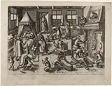 Pieter van der Borcht a contribué à la diffusion du genre de la « scène de singe » également appelée « singerie » (un mot qui signifie « grimace, comportement ou astuce comique[12] »[n 2]). Les scènes comiques avec des singes vêtus d'une tenue humaine et d'un environnement humain sont un genre pictural initié dans l'art flamand au XVIe siècle et développé par la suite au XVIIe siècle. Vers 1575, Pieter van der Borcht introduit la singerie en tant que thème indépendant dans une série de gravures fortement ancrées dans la tradition artistique de Pieter Bruegel l'Ancien. Ces gravures ont été largement diffusées et le thème a ensuite été repris par d'autres artistes flamands, en particulier par des artistes anversois tels que Frans Francken II, Jan Brueghel l'Ancien et le Jeune, Sébastien Vrancx et Jan van Kessel. David Teniers le Jeune devient le principal pratiquant du genre et le développe plus avant avec son frère cadet Abraham Teniers. Plus tard au XVIIe siècle, Nicolaes van Verendael a également commencé à peindre ces « scènes de singe »[13]. Certains historiens se demandent si le Pieter van der Borcht qui a été responsable de ce travail et bien le même que le sujet de cet article[6].