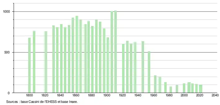 L'évolution du nombre d'habitants est connue à travers les recensements de la population effectués dans la commune depuis 1800. Pour les communes de moins de 10 000 habitants, une enquête de recensement portant sur toute la population est réalisée tous les cinq ans, les populations légales des années intermédiaires étant quant à elles estimées par interpolation ou extrapolation[13]. Pour la commune, le premier recensement exhaustif entrant dans le cadre du nouveau dispositif a été réalisé en 2005[14].