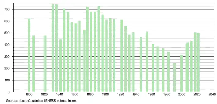 L'évolution du nombre d'habitants est connue à travers les recensements de la population effectués dans la commune depuis 1800. Pour les communes de moins de 10 000 habitants, une enquête de recensement portant sur toute la population est réalisée tous les cinq ans, les populations légales des années intermédiaires étant quant à elles estimées par interpolation ou extrapolation[14]. Pour la commune, le premier recensement exhaustif entrant dans le cadre du nouveau dispositif a été réalisé en 2007[15].