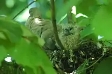 Les pigeonneaux naissent nus excepté quelques duvets jaunâtres. Ils ont des pattes plutôt roses et un bec aplati et sont plutôt gros pour leur taille.