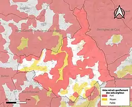 Le retrait-gonflement des sols argileux est susceptible d'engendrer des dommages importants aux bâtiments en cas d’alternance de périodes de sécheresse et de pluie. 74,6 % de la superficie communale est en aléa moyen ou fort (67,4 % au niveau départemental et 48,5 % au niveau national). Sur les 214 bâtiments dénombrés sur la commune en 2019, 121 sont en aléa moyen ou fort, soit 57 %, à comparer aux 81 % au niveau départemental et 54 % au niveau national. Une cartographie de l'exposition du territoire national au retrait gonflement des sols argileux est disponible sur le site du BRGM[22],[Carte 3].