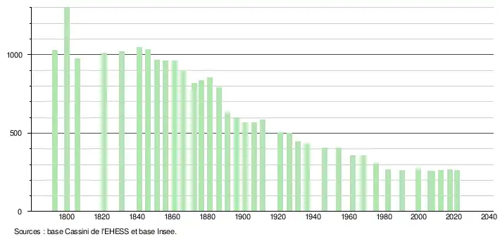 L'évolution du nombre d'habitants est connue à travers les recensements de la population effectués dans la commune depuis 1793. Pour les communes de moins de 10 000 habitants, une enquête de recensement portant sur toute la population est réalisée tous les cinq ans, les populations légales des années intermédiaires étant quant à elles estimées par interpolation ou extrapolation[36]. Pour la commune, le premier recensement exhaustif entrant dans le cadre du nouveau dispositif a été réalisé en 2007[37].