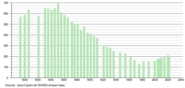 L'évolution du nombre d'habitants est connue à travers les recensements de la population effectués dans la commune depuis 1793. Pour les communes de moins de 10 000 habitants, une enquête de recensement portant sur toute la population est réalisée tous les cinq ans, les populations légales des années intermédiaires étant quant à elles estimées par interpolation ou extrapolation[26]. Pour la commune, le premier recensement exhaustif entrant dans le cadre du nouveau dispositif a été réalisé en 2004[27].