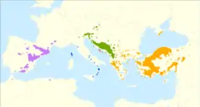 Cette aire est généralement divisée en trois régions principales. En Europe de l'Ouest on le trouve dans la moitié est de l'Espagne et dans le sud de la France, en Italie (Sicile incluse) et en Autriche. La partie centrale inclut la Yougoslavie, l'ouest de la Roumanie, la Bulgarie et la Grèce dans la péninsule des Balkans. La partie orientale inclut la Crimée et la Turquie. Les populations dans la région partagée entre l'Algérie et le Maroc[6] sont pratiquement moribondes[7].