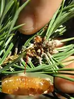 Il est résistant à la tordeuse européenne des pousses du pin (Rhyacionia buoliana (en))[6], apparue aux États-Unis en 1913 et au Canada en 1925[10]. Celle-ci s'attaque à diverses espèces de pins, dont le pin ponderosa (P. ponderosa)[6], le pin sylvestre (P. sylvestris)[11], le pin blanc ou pin de Weymouth (P. strobus)[12] ou le pin rouge (P. resinosa), espèces préférées par les sylviculteurs du nord-est des États-Unis jusqu'à ces dernières décennies et jusqu'à l'installation de cet insecte dont l'aire d'extension couvre à peu près celle du pin blanc (P. strobus)[12].