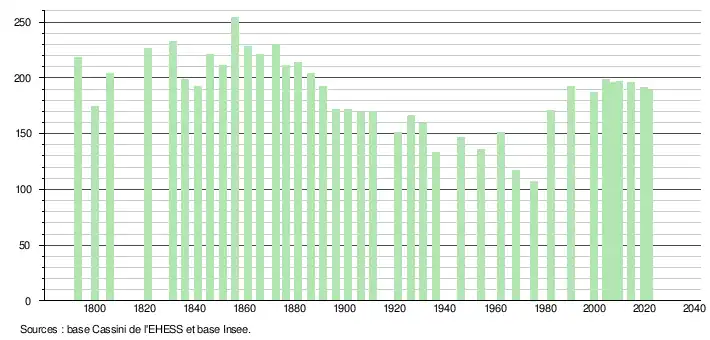 L'évolution du nombre d'habitants est connue à travers les recensements de la population effectués dans la commune depuis 1793. Pour les communes de moins de 10 000 habitants, une enquête de recensement portant sur toute la population est réalisée tous les cinq ans, les populations légales des années intermédiaires étant quant à elles estimées par interpolation ou extrapolation[19]. Pour la commune, le premier recensement exhaustif entrant dans le cadre du nouveau dispositif a été réalisé en 2004[20].