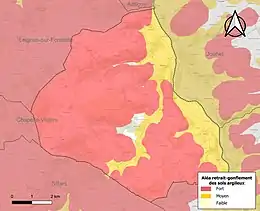 Les mouvements de terrains susceptibles de se produire sur la commune sont des affaissements et effondrements liés aux cavités souterraines (hors mines) et des tassements différentiels[17]. Afin de mieux appréhender le risque d’affaissement de terrain, un inventaire national permet de localiser les éventuelles cavités souterraines sur la commune[18]. Le retrait-gonflement des sols argileux est susceptible d'engendrer des dommages importants aux bâtiments en cas d’alternance de périodes de sécheresse et de pluie[19]. 98,3 % de la superficie communale est en aléa moyen ou fort (79,5 % au niveau départemental et 48,5 % au niveau national)[Carte 2]. Depuis le , en application de la loi ÉLAN, différentes contraintes s'imposent aux vendeurs, maîtres d'ouvrages ou constructeurs de biens situés dans une zone classée en aléa moyen ou fort[Note 3],[20].