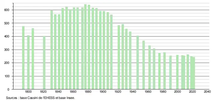 L'évolution du nombre d'habitants est connue à travers les recensements de la population effectués dans la commune depuis 1793. Pour les communes de moins de 10 000 habitants, une enquête de recensement portant sur toute la population est réalisée tous les cinq ans, les populations légales des années intermédiaires étant quant à elles estimées par interpolation ou extrapolation[24]. Pour la commune, le premier recensement exhaustif entrant dans le cadre du nouveau dispositif a été réalisé en 2008[25].