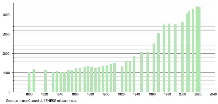 - Population municipale légale en vigueur au 1er janvier 2024, millésimée 2021, définie dans les limites territoriales en vigueur au 1er janvier 2023, date de référence statistique : 1er janvier 2021.