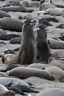 Les pinnipèdes peuvent produire un certain nombre de vocalisations telles que des aboiements, des grognements, des grincements, des gazouillis, des trilles, des cliquetis et ses sifflements. Ces sons sont émis à la fois à l'air libre et sous l'eau. Les otariidés communiquent plus volontiers sur terre, tandis que phocidés le font généralement dans l'eau. Les phoques de l'Antarctique sont davantage entendus sur terre que les phoques de l'Arctique car ils ne sont pas menacés par des prédateurs terrestres comme l'ours polaire[91]. Les cris des mâles présentent généralement des fréquences inférieures à ceux des femelles[92]. Les vocalisations sont particulièrement importantes pendant les saisons de reproduction. En effet, les éléphants mâles par exemple annoncent leur statut et menacent leurs rivaux par un puissant cri semblable à un tambour[93], dont il peut faire varier la résonance grâce à sa trompe[94]. Les mâles otariidés aboient, grondent, et rugissent. Les morses mâles sont connus pour produire un appel caractéristique pour attirer les femelles. Ils peuvent également produire des sons musicaux avec leur gorge gonflée[93].