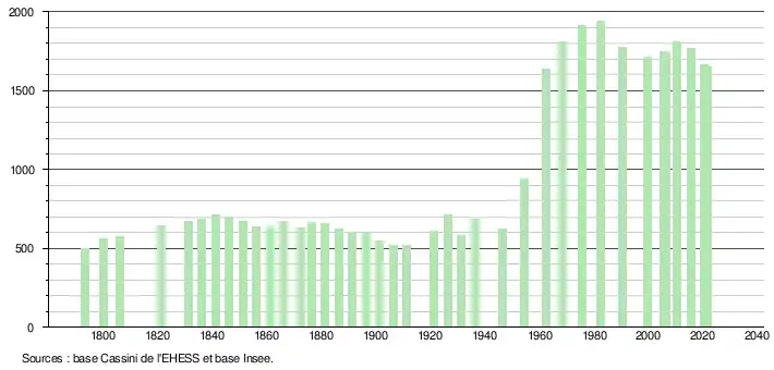 L'évolution du nombre d'habitants est connue à travers les recensements de la population effectués dans la commune depuis 1793. Pour les communes de moins de 10 000 habitants, une enquête de recensement portant sur toute la population est réalisée tous les cinq ans, les populations légales des années intermédiaires étant quant à elles estimées par interpolation ou extrapolation[27]. Pour la commune, le premier recensement exhaustif entrant dans le cadre du nouveau dispositif a été réalisé en 2005[28].