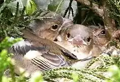 Les pinsons des arbres fraîchement éclos montrent un duvet gris fumé pâle sur le dessus du corps, les ailes, les cuisses et le ventre au début. La peau est de couleur rose chair. La gorge est rose foncé, le renflement du bec est blanc ou crème à teinte jaunâtre[4]. Les jeunes oiseaux ressemblent aux femelles adultes, mais les plumes de la tête et du corps sont un peu plus courtes et plus douces, les plumes rectrices sont plus étroites et s'étendent de façon plus pointue[3].