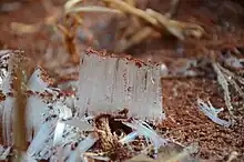 Après une semaine de temps chaud, une rapide chute de température à -20 degrés Celsius a créé ces aiguilles de glace de plus de 12 cm (Québec, hiver 2014-2015)