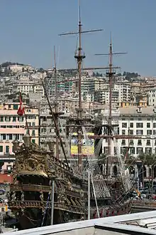 - Le galion espagnol Le Neptune est dans un premier temps établi sous la houlette de Milchan comme un élément de décor. Conformément à la volonté de Polanski d'avoir un vrai bateau au lieu d'une maquette, le galion est construit à l'arsenal de Port El-Kantaoui (Tunisie) en avril 1984. À cause de son réalisme, la construction nécessite pas moins de 2 000 ouvriers. Après presque deux ans de travail, le galion est enfin achevé pour un coût total de 8 000 000 dollars. Lloyd's l'assure pour 30 000 000 dollars. Sa perte aurait signifié l'abandon du film[2]. Le galion, à échelle 1, reproduit plus ou moins le type de navire espagnol du XVIe siècle. Une grande partie est construite en bois, à commencer par la coque au-dessus de la ligne de flottaison, le reste étant en acier (mâts supérieurs et coque sous la ligne de flottaison) ou en matériau composite maquillé. Il est également équipé d'un moteur de 400 chevaux et enregistré en Tunisie comme un appareil navigable. Il est ensuite réutilisé comme décor pour l'émission télévisée Mission Pirattak puis offert par Tarak Ben Ammar à la ville de Cannes lors du Festival de Cannes 1987, durant lequel on le trouve à quai dans le vieux port. Il est actuellement amarré dans le port de Gênes en Italie et sert d'attraction touristique.