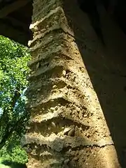 Les murs de pisé non recouverts de crépi laissent souvent voir en France les couches de mortier (sapines) qui servent à améliorer la cohésion entre les différentes banchées. Dans d'autres régions, il n'y a pas de liants entre les différentes banchées (comme au Maroc par exemple). Sur certains murs en pisé, les couches de mortier rapprochées (moins de 50 cm d'écart) que l'on peut voir ont un autre rôle. Elles sont disposées uniquement sur les bords du banchage en même temps que la terre soit pour améliorer la résistance à l'érosion de la surface du mur (comme dans les coins de la construction en photo ci-contre), soit pour améliorer l'accroche de l'enduit. On y voit aussi souvent les trous (les clefs) qui servaient à la fixation de l'échafaudage et des banches.