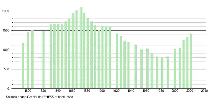 L'évolution du nombre d'habitants est connue à travers les recensements de la population effectués dans la commune depuis 1793. Pour les communes de moins de 10 000 habitants, une enquête de recensement portant sur toute la population est réalisée tous les cinq ans, les populations légales des années intermédiaires étant quant à elles estimées par interpolation ou extrapolation[26]. Pour la commune, le premier recensement exhaustif entrant dans le cadre du nouveau dispositif a été réalisé en 2006[27].