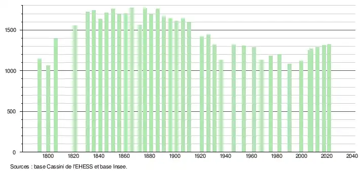 L'évolution du nombre d'habitants est connue à travers les recensements de la population effectués dans la commune depuis 1793. Pour les communes de moins de 10 000 habitants, une enquête de recensement portant sur toute la population est réalisée tous les cinq ans, les populations légales des années intermédiaires étant quant à elles estimées par interpolation ou extrapolation[23]. Pour la commune, le premier recensement exhaustif entrant dans le cadre du nouveau dispositif a été réalisé en 2007[24].
