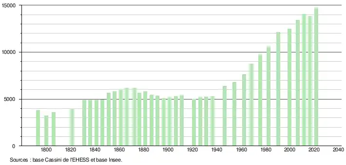 - Par convention dans Wikipédia, le principe a été retenu de n’afficher dans le tableau des recensements et le graphique, pour les populations légales postérieures à 1999, que les populations correspondant à une enquête exhaustive de recensement pour les communes de moins de 10 000 habitants, et que les populations des années 2006, 2011, 2016, etc. pour les communes de plus de 10 000 habitants, ainsi que la dernière population légale publiée par l’Insee pour l'ensemble des communes.