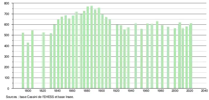 L'évolution du nombre d'habitants est connue à travers les recensements de la population effectués dans la commune depuis 1793. Pour les communes de moins de 10 000 habitants, une enquête de recensement portant sur toute la population est réalisée tous les cinq ans, les populations légales des années intermédiaires étant quant à elles estimées par interpolation ou extrapolation[21]. Pour la commune, le premier recensement exhaustif entrant dans le cadre du nouveau dispositif a été réalisé en 2005[22].