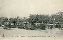 La place de l'Étoile est un pôle majeur de transports en commun depuis le XIXe siècle. On voit ici le terminus du tramway Paris - Saint-Germain (PSG), du temps de son exploitation par les TMEP, l'un des lointains ancêtres de la RATP, entre 1911 et 1921.