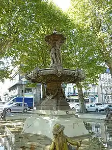 La fontaine Delille en mai 2017, au centre de la place, vue depuis le sud. | ||||