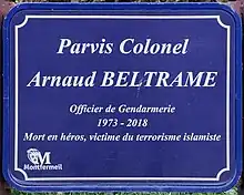 - Le 23 mai 2018, le conseil municipal décide de nommer le parvis en l'honneur d'Arnaud Beltrame[7]. L'inauguration a eu lieu lors de la commémoration de l'appel du 18 juin[8].