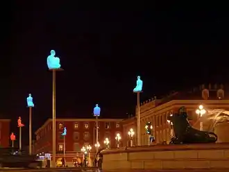 L’évolution de la fontaine du soleil, ou plutôt son retour à sa forme initiale, n’est pas le seul changement notable permis par le dallage et la mise en place de la rame de tramway. Dans le cadre de l'installation d'œuvres d'art contemporain tout au long du parcours du tramway, d’autres représentations artistiques ont été mises en place depuis 2007. En effet, la place Masséna compte désormais sept statues en résine blanche à une dizaine de mètres au-dessus du sol. On remarque la position accroupie ou assise de ces scribes statufiés en haut de leur socle. De plus, elles s'éclairent la nuit grâce à des jeux de lumière qui changent et qui font d’elles des "Sitting Tatoos", à savoir des hommes translucides qui s'illuminent de différentes couleurs selon l'instant. Elles ont été réalisées par le sculpteur catalan Jaume Plensa, qui jouit également d’une renommée mondiale (architecte notamment de la Crown Fountain qui se trouve dans Millennium Park de Chicago).